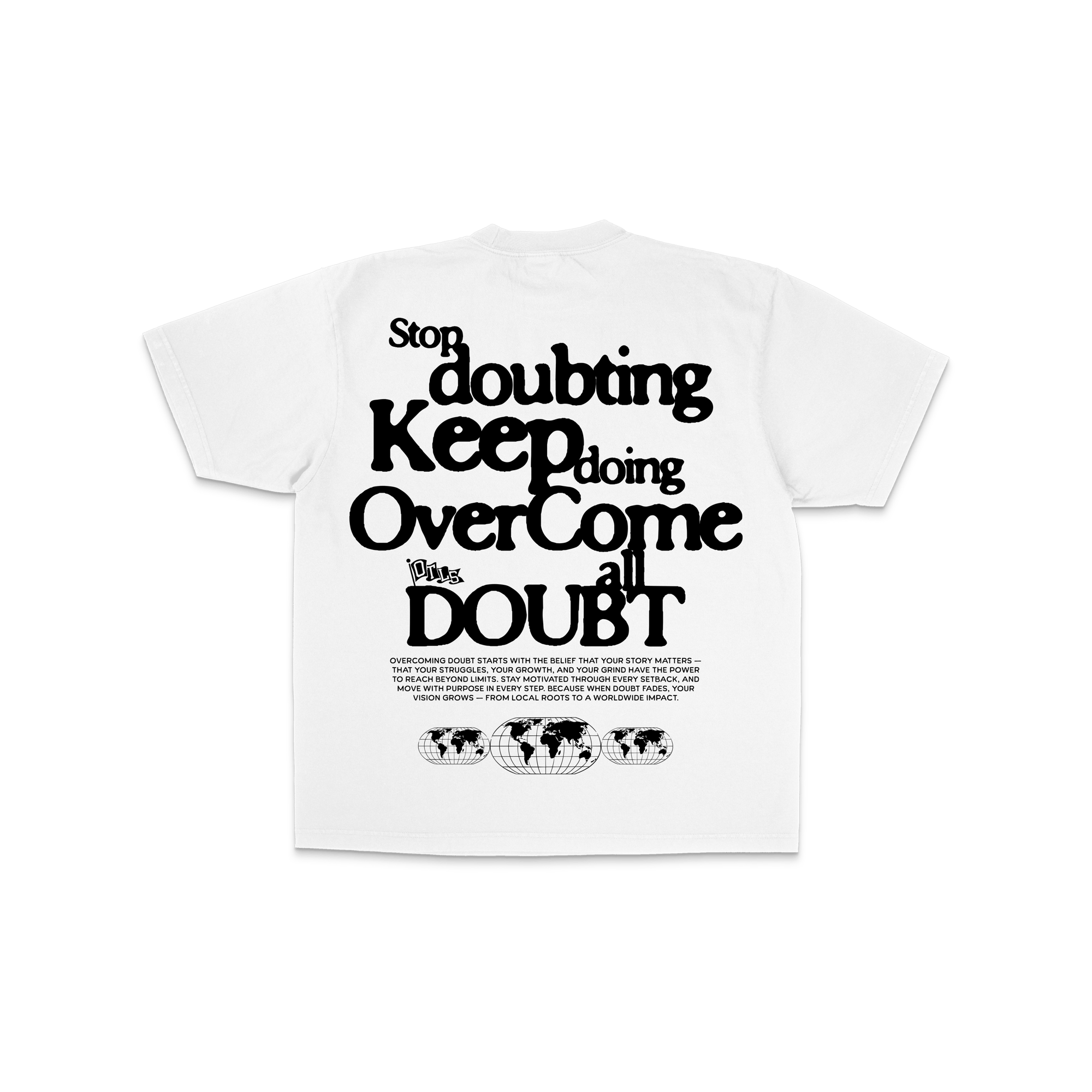 With a cropped and relaxed, street-ready silhouette, it’s perfect for making a statement without saying a word. The back features our “Stop Doubting” graphic — a daily reminder to trust your grind, believe in your vision, and push through.